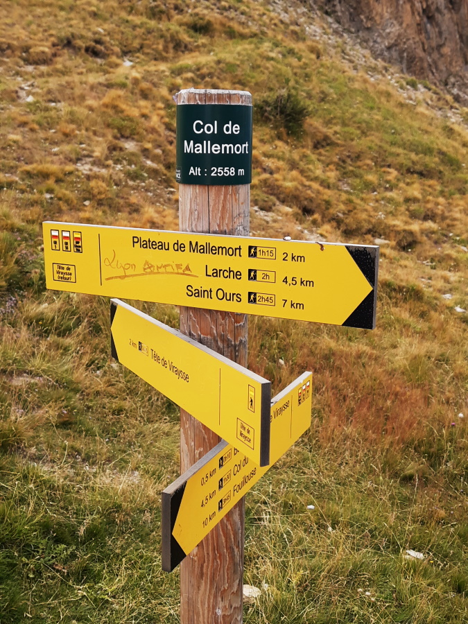 De afdaling is weer heel goed te doen zoals we al eerder opmerkten in dit deel van de Alpen. Het pad gaat in een aantal haarspeldbochten naar beneden zonder echt steil te zijn, alleen wat smal hier en daar. Er zijn lager wat behoorlijk geërodeerde stukken die wat meer voorzichtigheid vragen, maar we komen uiteindelijk zonder problemen op het plateau van Mallemort uit waar we nu langzaam dalen door de grasvelden. Hier zien we onze Franse vrienden weer die inderdaad zitten te lunchen. En natuurlijk uitgerekend hier op een makkelijk stuk val ik; niet hard, gewoon op mijn kont, maar als ik overeind wil komen zet ik mijn rechterhand vol in een doornstruikje en heb ik ene stuk of 20 van die vervelende kleine naaldjes in mijn hand heb. Een hoop krijgen we er meteen weer uit, maar natuurlijk niet allemaal en in het handvat van mijn rechter wandelstok knijpen voelt even niet zo prettig. Weinig aan te doen nu.